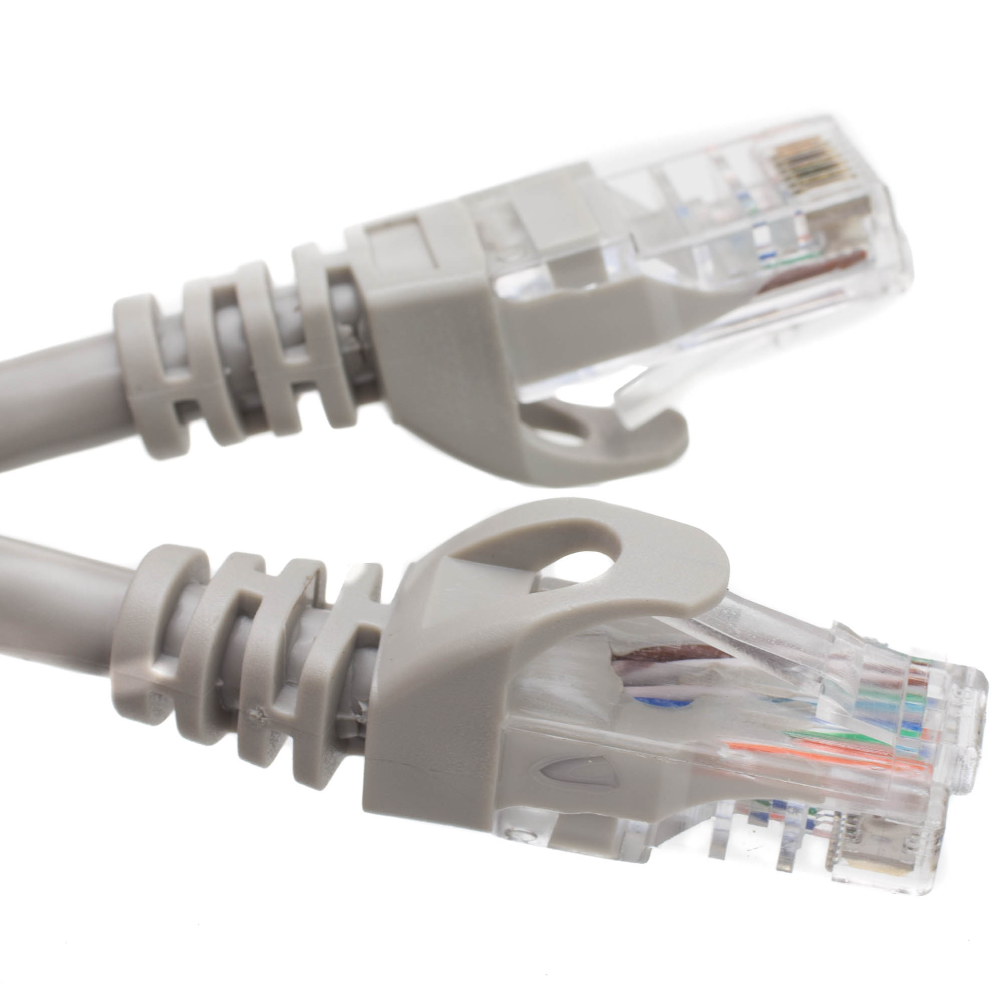 This is a gray patch cable with molded boots (snagless installation) and extra protection for the RJ45 connector and clip. The connectors are wired to the T568B standard. The individual conductors are 24 AWG (American wire gauge) stranded pure copper. Cat5e patch cables are stranded to improve flexibility. Pure copper conductors provide the best signal possible. The RJ45 plug features gold connectors to prevent corrosion thus ensuring a longer cable life. Our Cat5e Ethernet patch cables exceed the ANSI/TIA-568.2-D standard.
